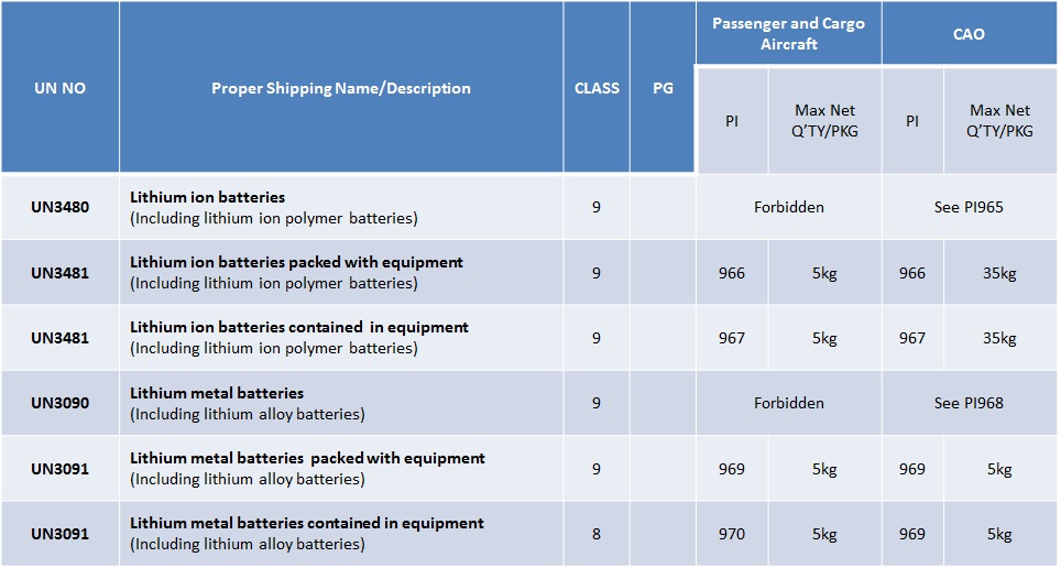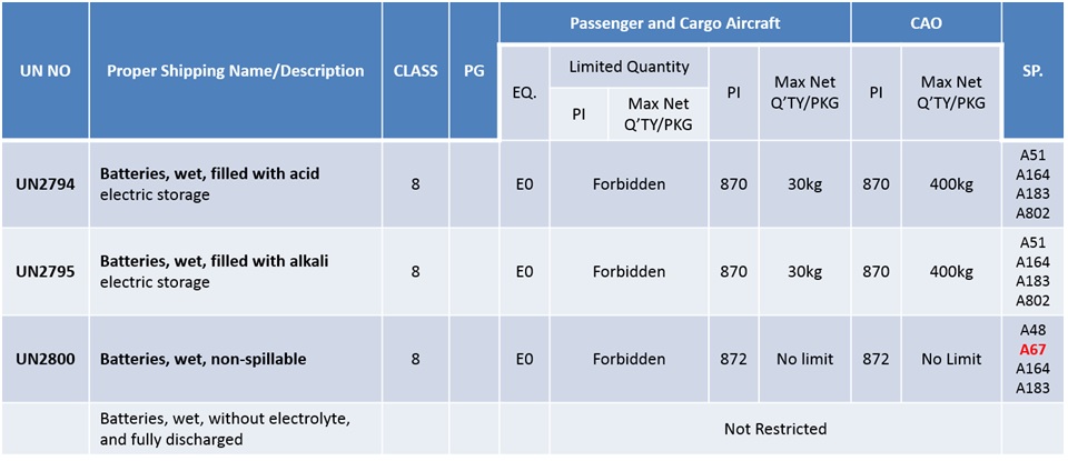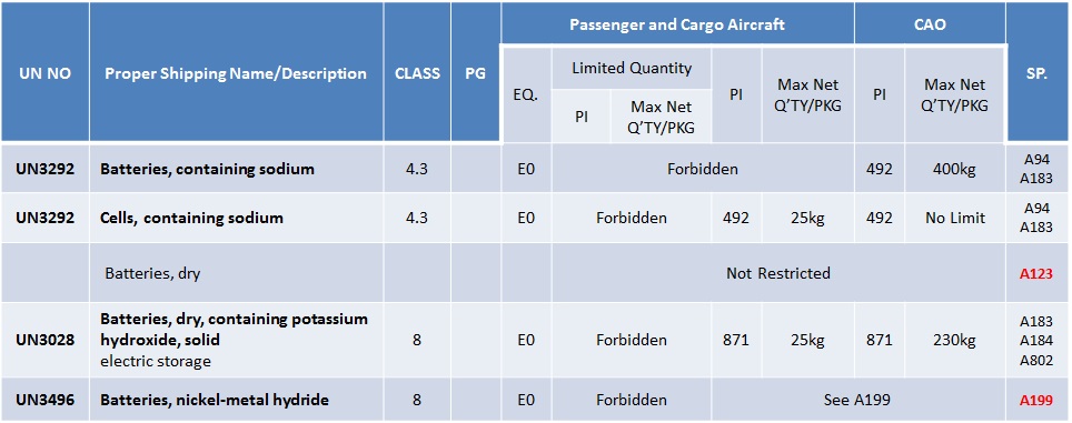 A123) 本條目適用於未列入IATA DGR第4.2章節的電池,蓄電池。如鹼錳電池,鋅 - 碳電池和鎳 - 鎘電池。任何電池或以電池提供電源的設備在運送過程中,必須有預防短路和防止意外啟動,可視為非受限制貨物,須在提單加註 ”Not Restricted”和Special Provision A123在 ”Handling Information”欄位。